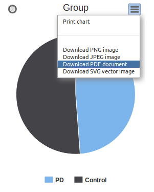 Besides the chart exports, data can be exported to CSV, JSON, or tranSMART file format, available in the Export menu. These include the following options: