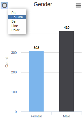 Graphical widgets, which represent the outcome of certain statistics (such as distribution or correlation) can be of 5 chart types: pie, column, bar, line, and polar.